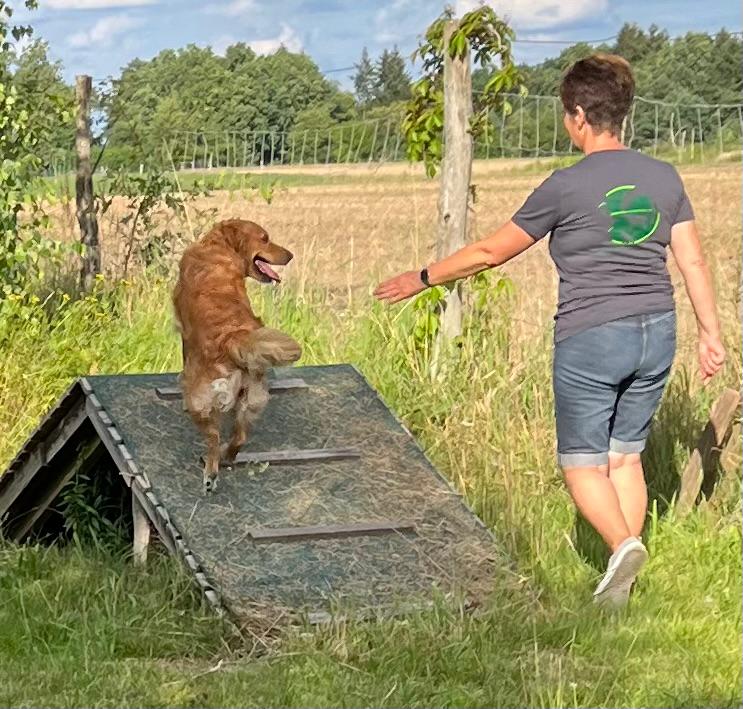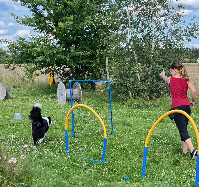 Beim Hoopers-Agility führst Du Deinen Hund aus der Entfernung durch den Parcours, mittels Deiner Körpersprache, Deiner Hör und Sichtzeichen.